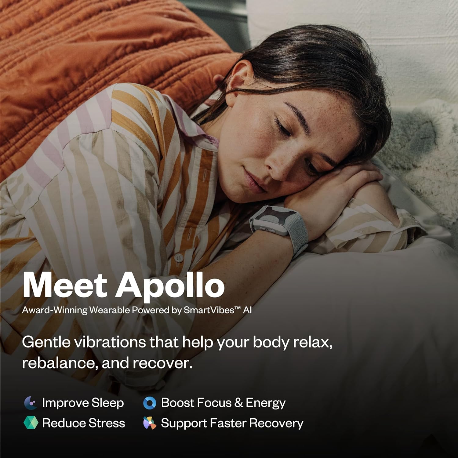 • WORLD’S MOST ADVANCED WEARABLE WELLNESS AI – Experience up to 60 more minutes of nightly sleep with the first technology designed to prevent unwanted wake-ups before they happen. Apollo adapts to your day and night with effortless, real-time personalization and integrates with Oura Ring for even smarter insights and more precise sleep optimization. Delivering gentle vibrations that support vagus nerve activity, it enhances your nightly neuro sleep and recharge routine as a modern sleep aid.